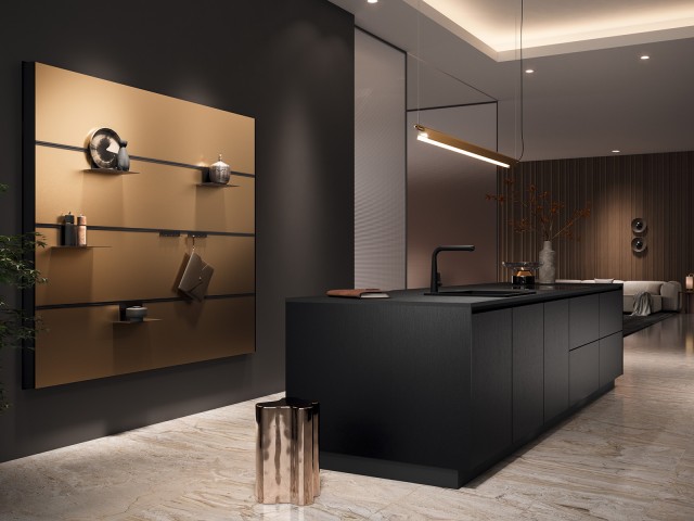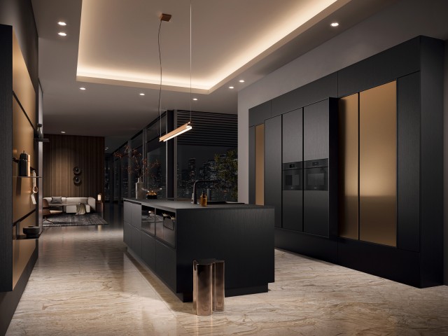 Концепция oneLine — это строгие линии и лаконичность, характерные для современных немецких кухонь. Безручковые фасады и чёткая геометрия создают ощущение порядка и лёгкости. Все элементы выполнены в одной плоскости, что подчёркивает простор и гармонию интерьера. В сочетании с бронзовыми поверхностями AV 7070-GL Bronze дизайн выглядит современно и вневременно, отражая концепцию кухни Made in Germany — высокое качество, функциональность и элегантность.