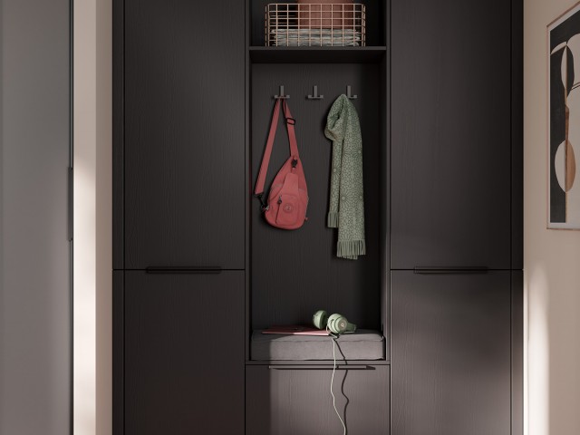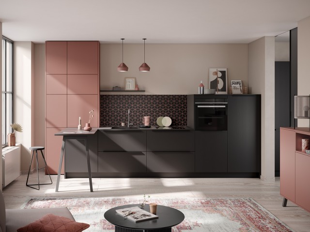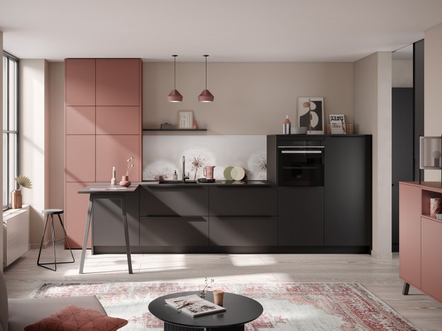 Фасады из коллекции CALGARY Samteiche-Schwarz выполнены в насыщенном темном цвете с матовой поверхностью, что придает кухне современный и изящный вид. Декоративные чёрные детали в виде ручек, смесителя и стальной мойки создают стильные акценты, усиливая минималистичный стиль интерьера.