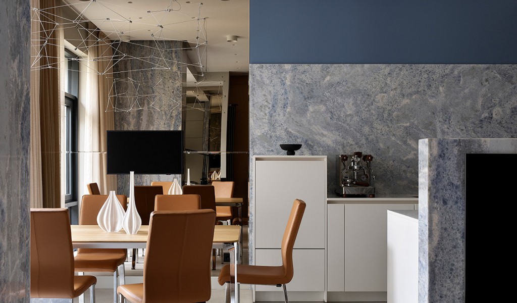 Остров соединен с основной частью барной накладной из массива ореха, за которой организованы посадочные места.