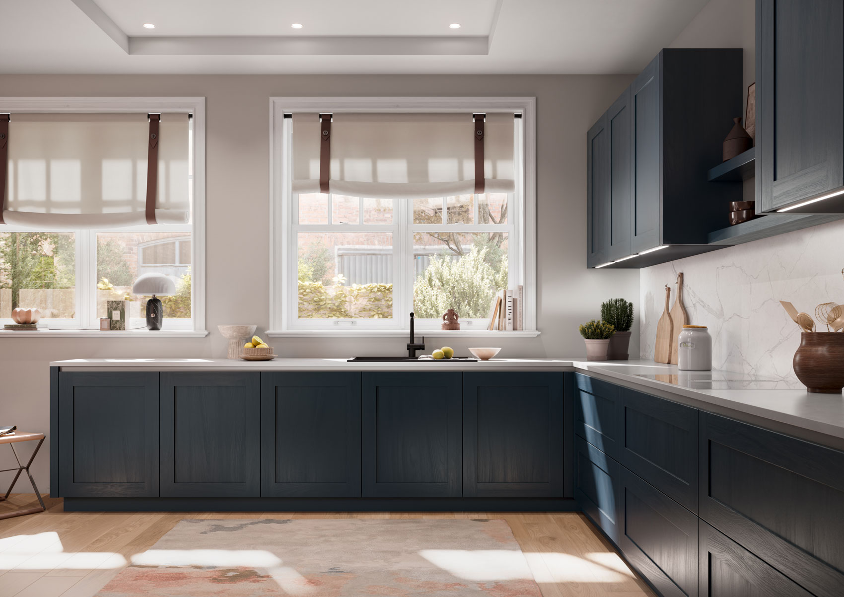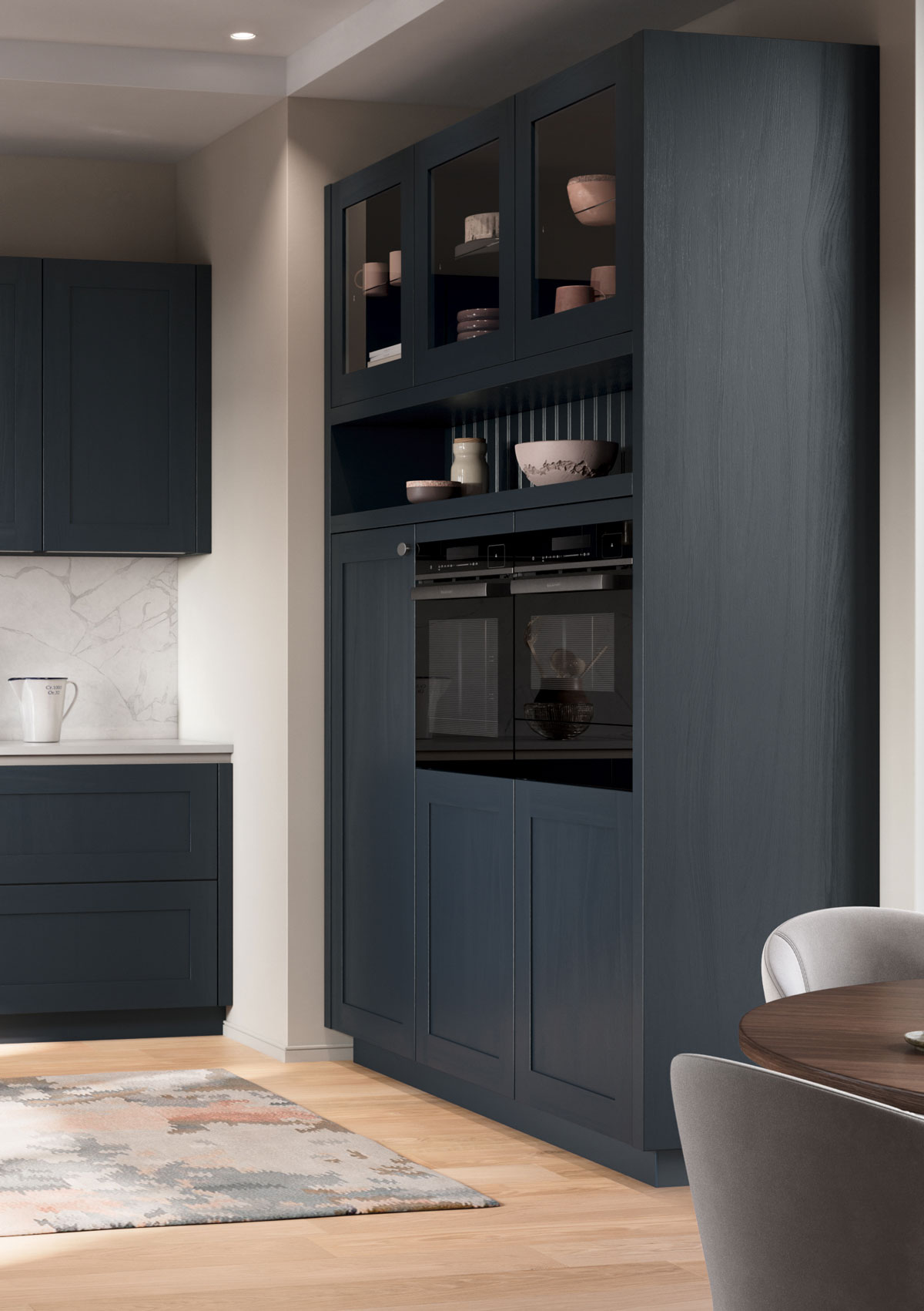 Глубокий сине-фиолетовый оттенок Samtblau, меняющийся в зависимости от освещения, придает интерьеру теплоту или прохладу, создавая гармоничное единство с натуральными материалами. Элегантные фасады без ручек в стиле oneLine обеспечивают чистоту линий.