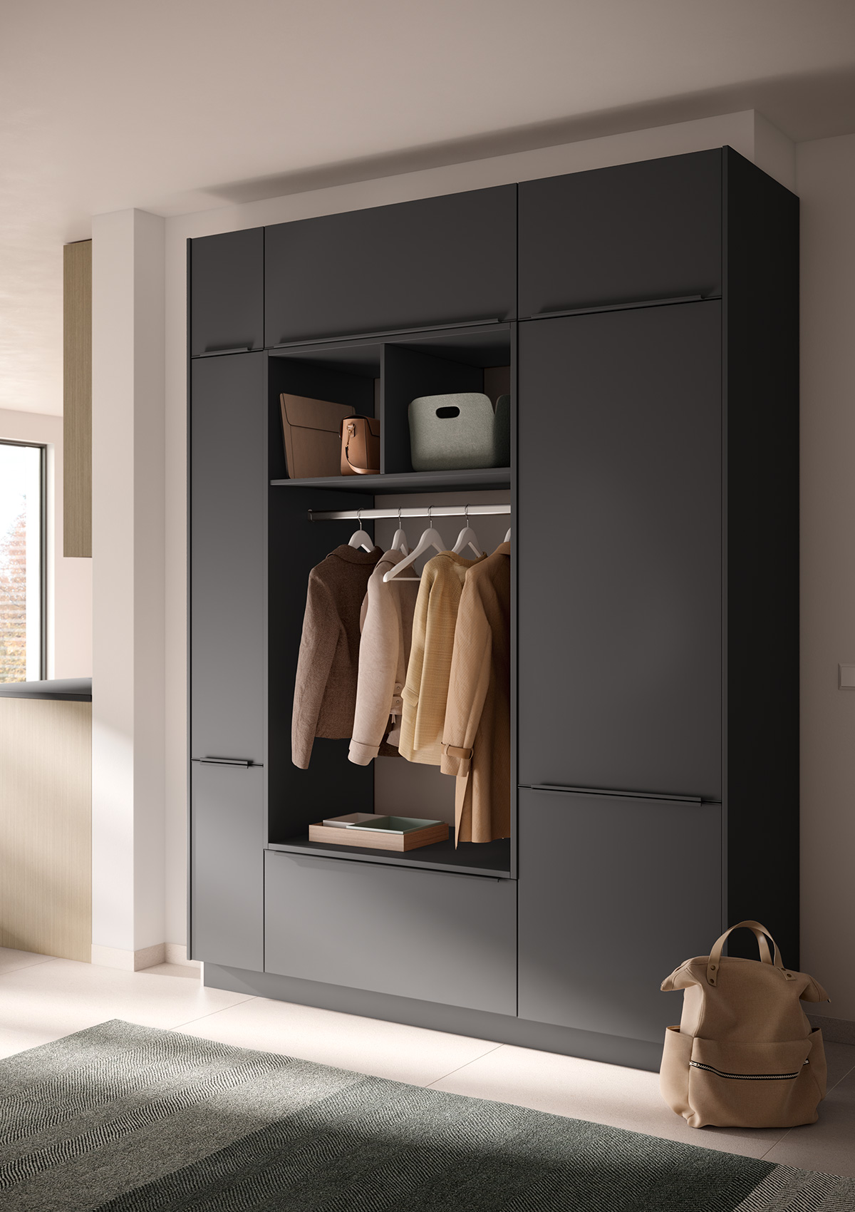 Что делает гардероб действительно хорошим? Он должен быть удобным, вместительным и легко подстраиваться под ваши нужды — по высоте, ширине, с открытыми или закрытыми секциями. Такой дизайн помогает максимально эффективно использовать пространство. Например, на этом фото — стильный гардероб с местом для вешалок и открытыми полками для шапок, шарфов или зонтиков. Его минималистичный дизайн и спокойные тона создают элегантную атмосферу. Гладкие фасады и аккуратное оформление с практически незаметными ручками подчеркивают современные строгие линии.