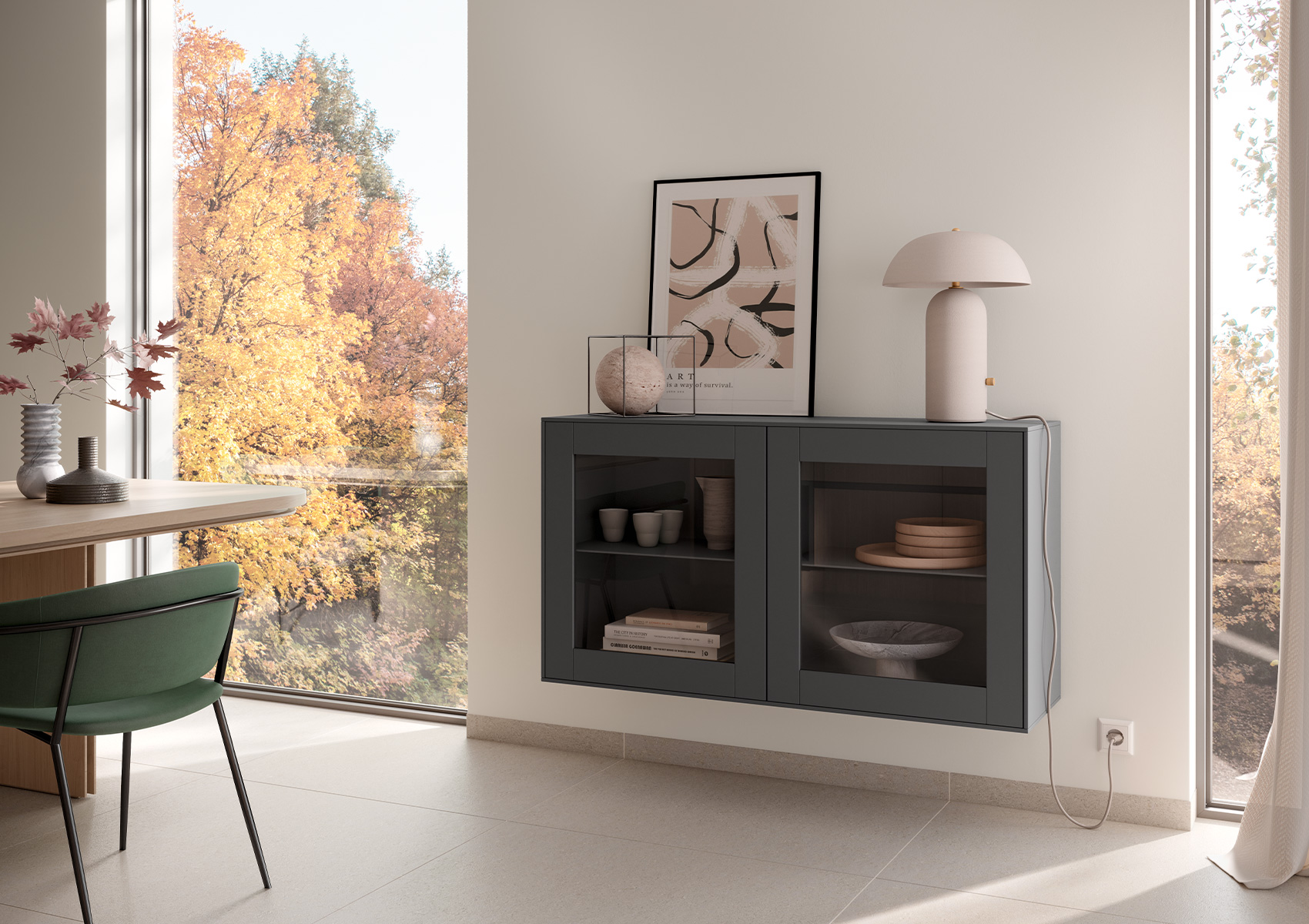 Навесной шкаф словно парит в воздухе и делает пространство легким. Он служит для хранения посуды, книг или декоративных предметов и помогает держать комнату в порядке. Стеклянные дверцы позволяют видеть, что внутри, и создают более легкий дизайн. Темные антрацитовые фасады отлично сочетаются с кухней Feineiche-hell, делая яркие декоративные элементы особенно выразительными.
