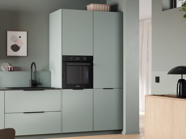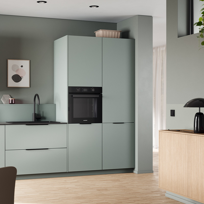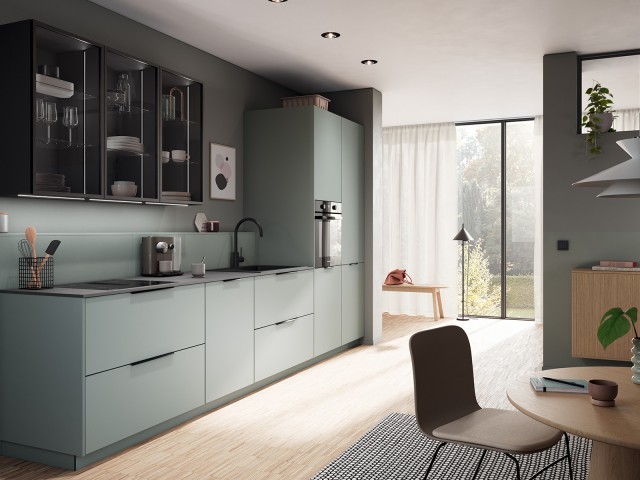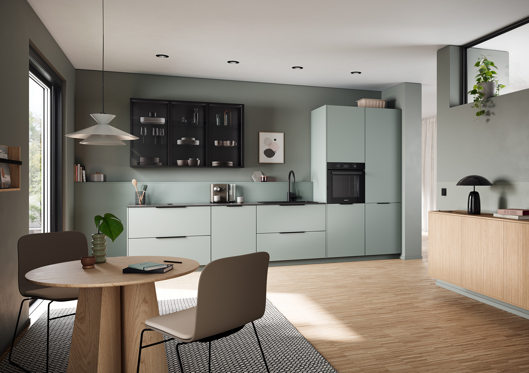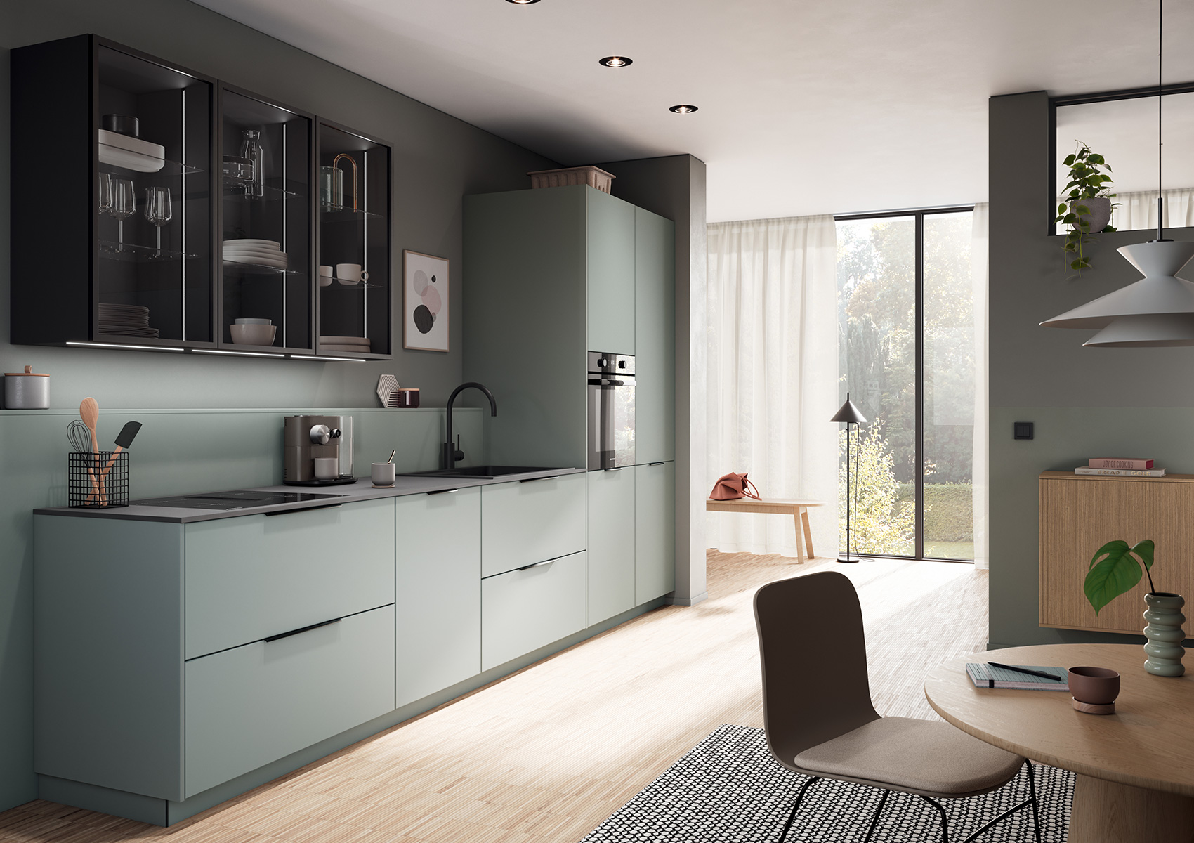 Благодаря нежному зелёному цвету (Eukalyptusgrün) кухня выглядит свежо, спокойно и уютно.
