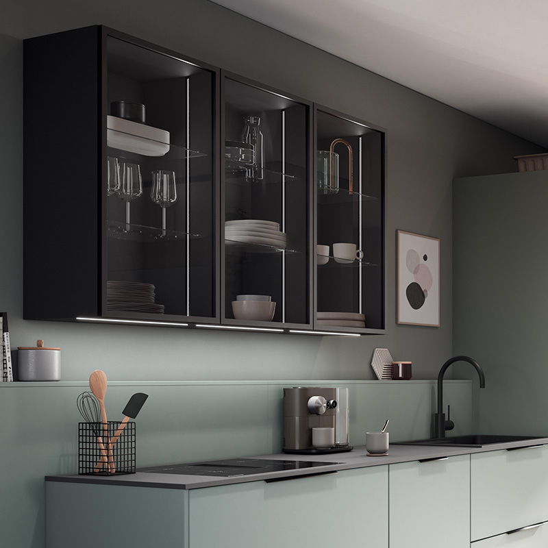 Для создания воздуха и ощущения открытости кухня SCALA использует верхние шкафчики со стеклянными дверцами. Прозрачные фасады визуально расширяют пространство и делают небольшие квартиры более просторными. Встроенное освещение подчёркивает красоту содержимого, а матовые чёрные металлические рамки гармонично дополняют минималистический дизайн, делая хранение не только удобным, но и стильным фокусом интерьера.
