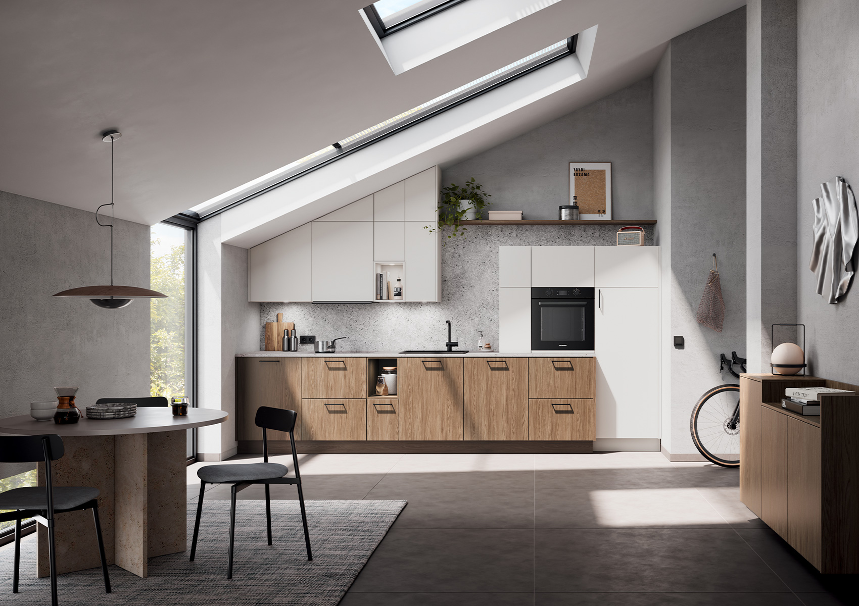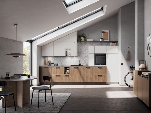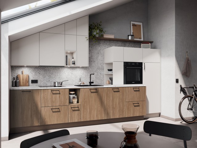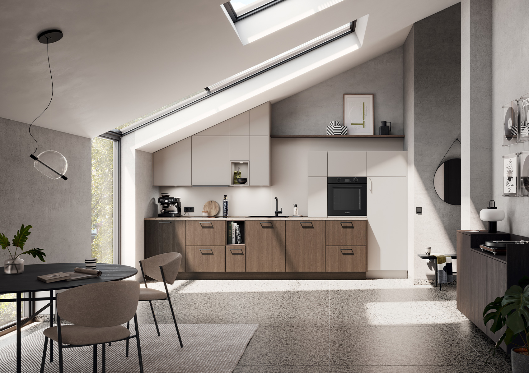 Особенно в мансардных помещениях с наклонными потолками важен каждый сантиметр. Наши проекты кухонь максимально эффективно используют пространство с помощью удобных систем хранения и долговечных, лёгких в уходе материалов. Фасады в оттенках AURA Steinbeige или PERFECT SOFT Sandgrau создают спокойный, элегантный образ, а древесные текстуры, например BALI Eiche-trüffelbraun или TORONTO Ulme-mocca, придают тёплую и уютную атмосферу. В итоге получается стильная мансардная кухня, которая гармонично сочетает функциональность и дизайн – качество Made in Germany.