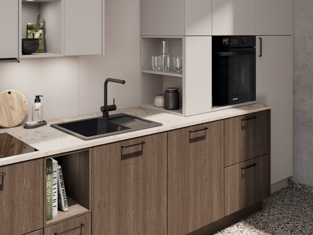 Фасады TORONTO Ulme-mocca, выделяются натуральной древесной текстурой и долговечным, простым в уходе покрытием. Нежный серо-бежевый цвет PERFECT SOFT Sandgrau добавляет минималистичной элегантности. Будь то древесная фактура или матовые поверхности – все материалы рассчитаны на долговечность и лёгкую чистку, что особенно важно для семей и ежедневного использования.